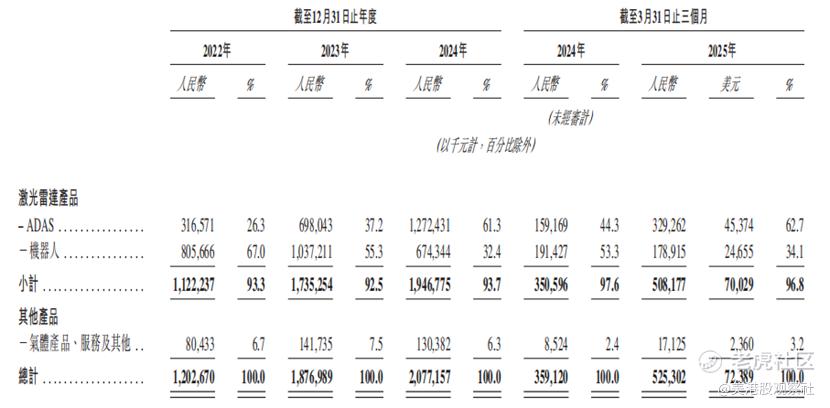 而按照产品收入结构来看,激光雷达产品占比贡献了90%以上的收入,2024年达到93.7%,其中,ADAS占比61.3%,机器人占比32.4%。